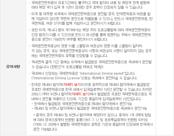 대한민국에서 국제 운전면허를 취득했다 하더라도 나라마다 틀리기 때문에 잘 알아보아야 한다.