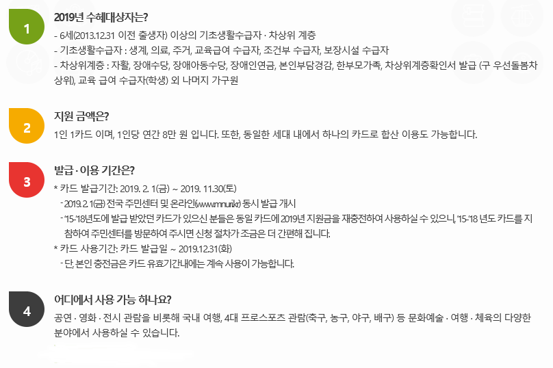 기초. 차상위 계층을 대상으로 한 분야 향유 지원으로 삶의 질 향상 및 계층 간 문화격차 해소를 위하여 발급되는 카드이다.