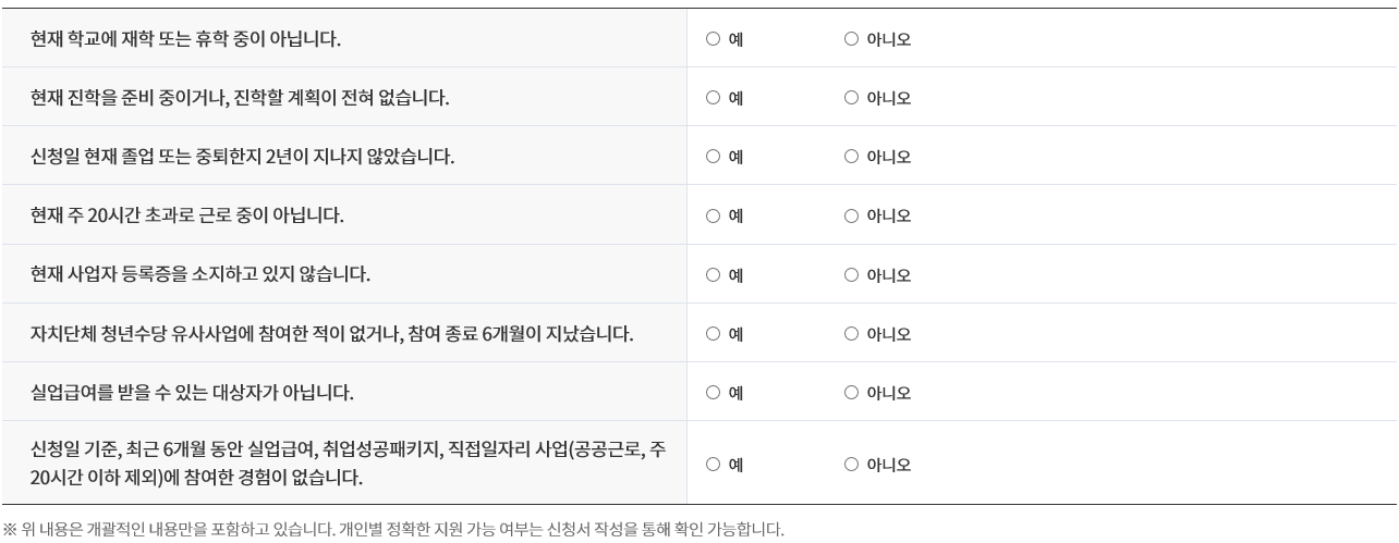 | 만 18세 ~ 34세 | 졸업·중퇴 이후 2년이내 | 미취업자 | 기준위소득 120% 이하 |