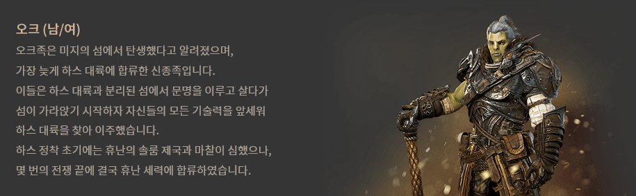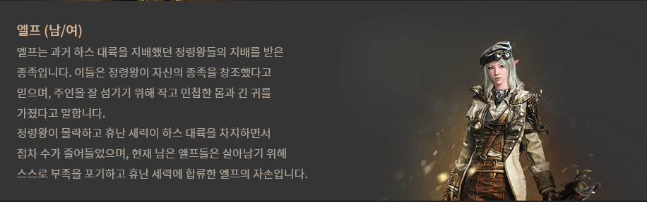 아인종을 제외한 휴난,엘프,오크 종족은 남/여 성별을 선택할 수 있습니다.
