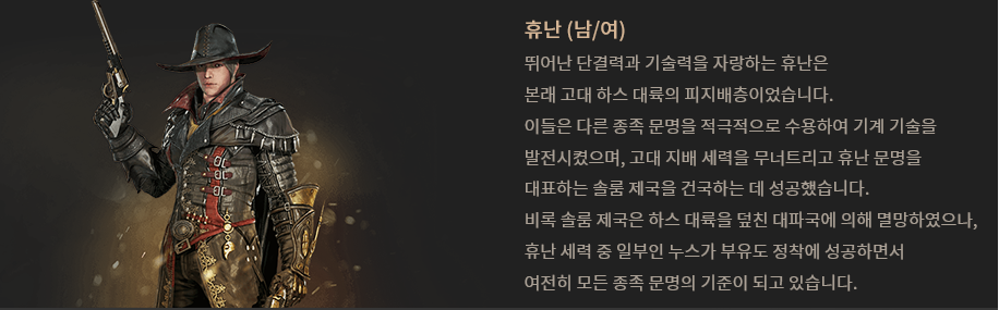 대파국 이후, 하늘에서 찾은 유일한 희망 태초에 하스 대륙은 정령과 드래건, 거인의 땅이었다. 그러나 하스의 심장을 둘러싼 세 세력의 고대 전쟁으로 대륙은 점차 황폐해지고, 수천 년 동안 계속된 핍박을 견디지 못한 인류는 생존을 위해 뭉치기 시작했다. 폭군에 대항하는 새로운 나라가 건국되면서 고대 지배 세력은 점차 몰락하였으며, 하스 대륙은 휴난과 오크, 엘프와 아인 종이 차지하게 되었다. |